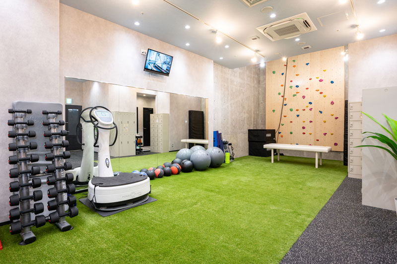 ケガをしない為の床構造、最高の人工芝・奥行き10m以上・天井高3mとトレーニング内容に制限をつける必要がなく、トレーナーにとってもトレーニングを提供する上で、最高の環境です。